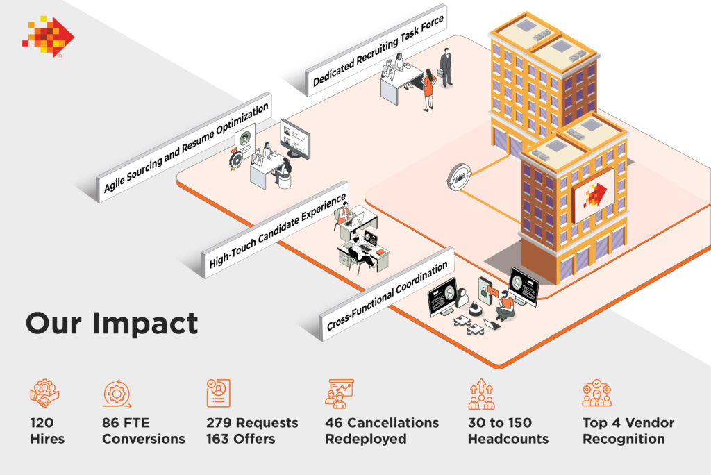 5,623 candidates sourced 2,092 offers issued 900 BYOD offers 625 successful starts 34% → 30% Attrition reduced Overview When a global healthcare solutions provider launched a workforce expansion initiative, SPECTRAFORCE was engaged to source, screen, and onboard thousands of candidates at speed. Facing tight timelines and high early-stage attrition, the challenge demanded not just operational […]